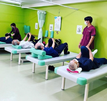 この施設は、入浴や食事といった直接的な介護支援ではなく、身体機能の維持・回復を目的とした訓練を専門に行っています。リハビリ器具「レッドコード」を使用し、体幹を鍛える訓練をはじめ、ご自宅でも簡単にできる寝ながら行うストレッチや筋力トレーニングも、スタッフが付き添いながら丁寧にサポートします。